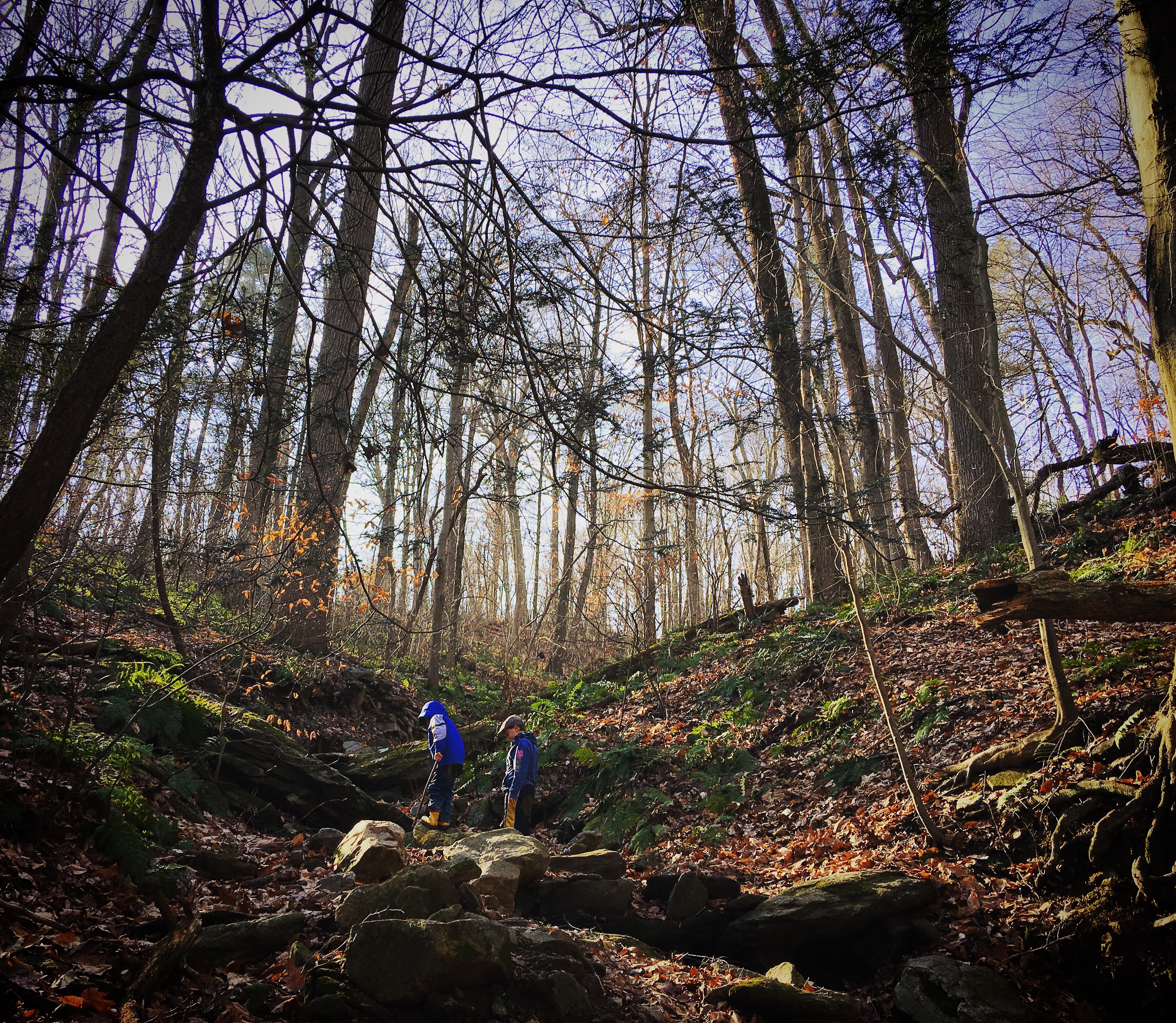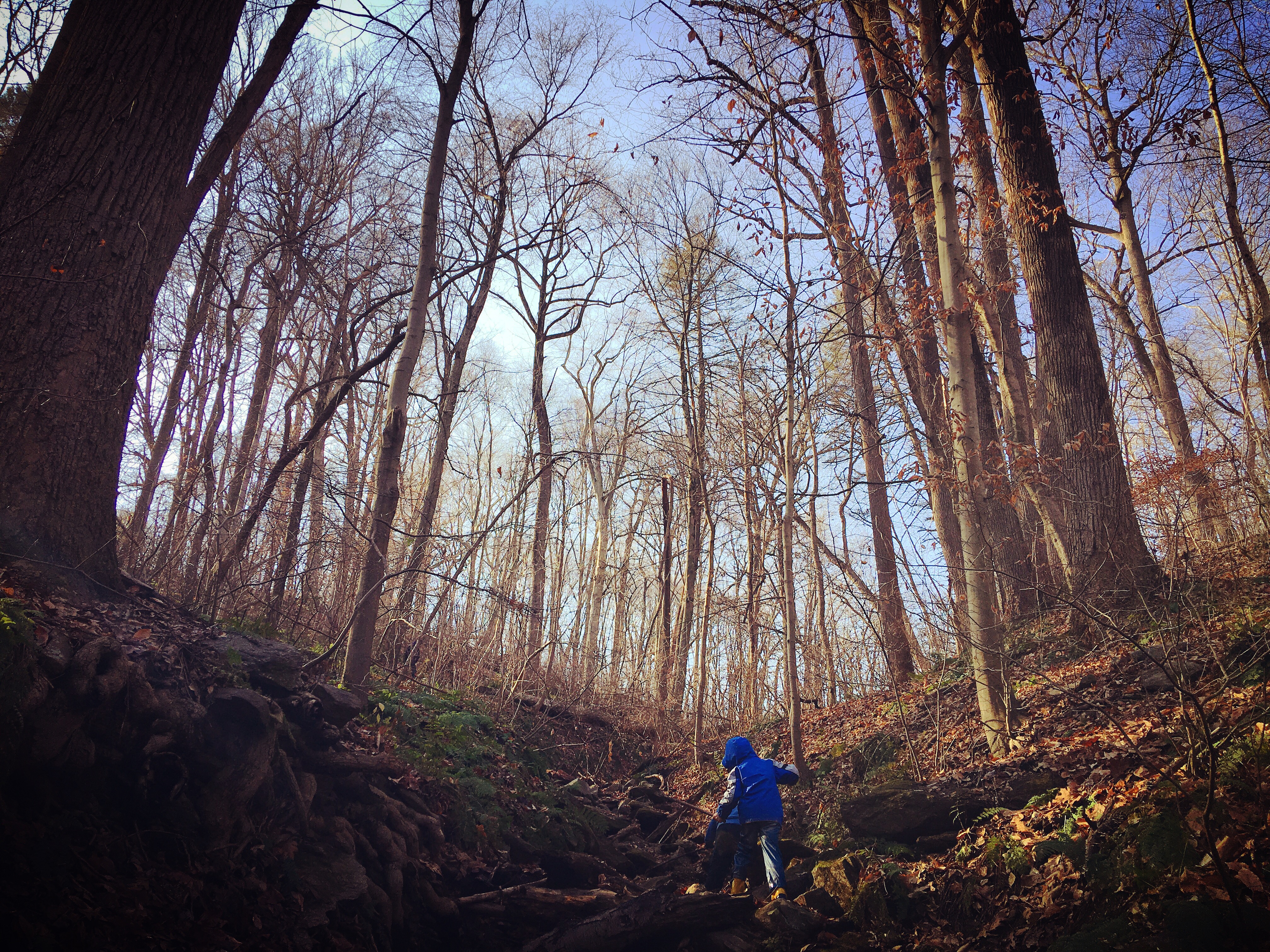 Philadelphia's Forest Explorers met again today for some unstructured play time in the woods beside Wissahickon Creek. Today we heard a tree fall in the forest and went to explore. There the kids walked along a small muddy creek bed that snaked up the side of a hill and found forts along the way. Even with the cold weather settling in, we're looking forward to welcoming new families in the future. Come explore with us!
